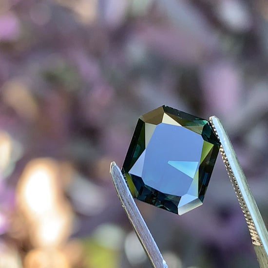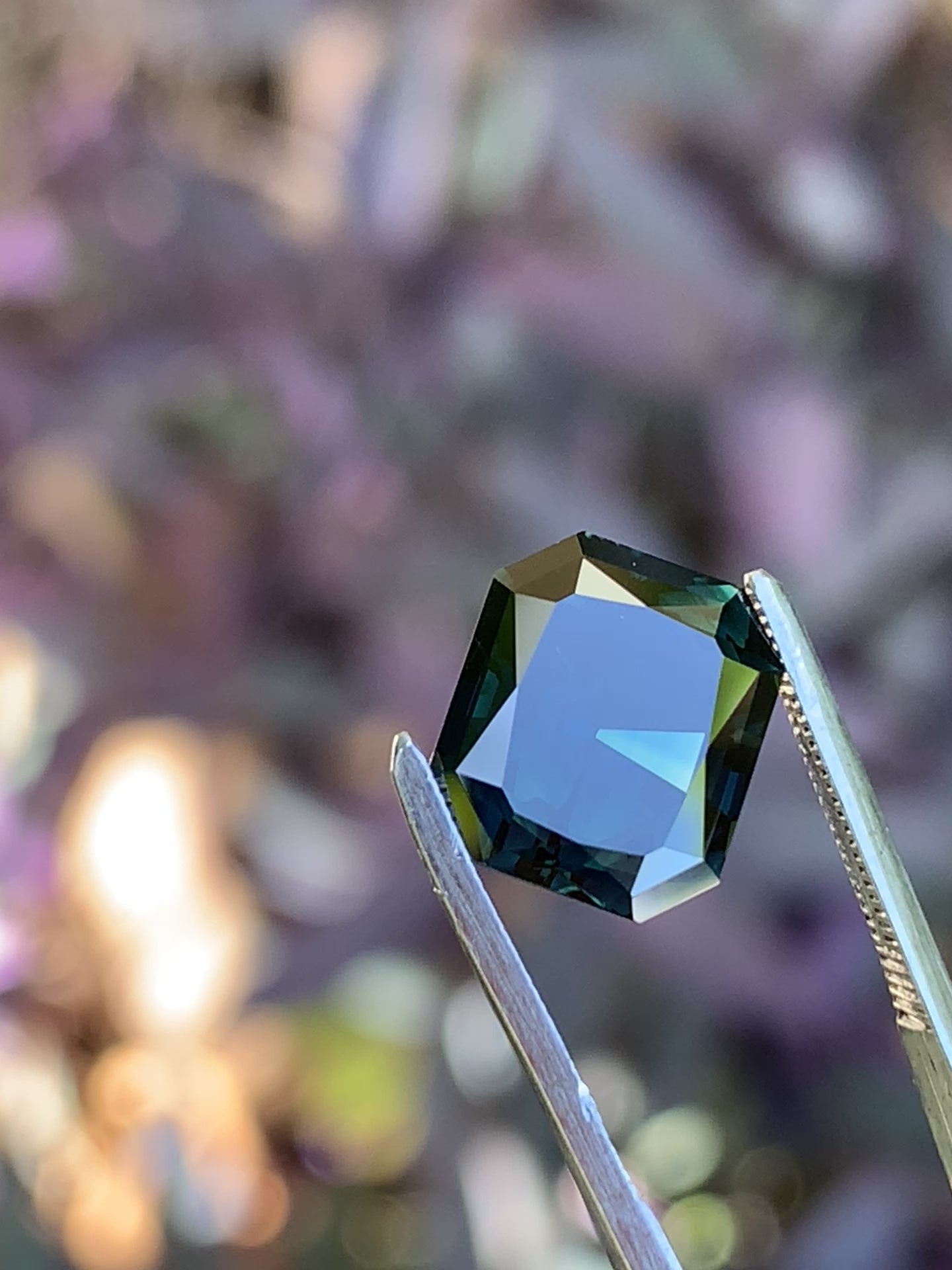 This particular stone is cut into emerald mix cut, with a primary colour of dark blue/green, good clarity eye clean stone.