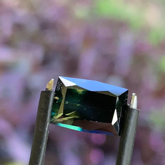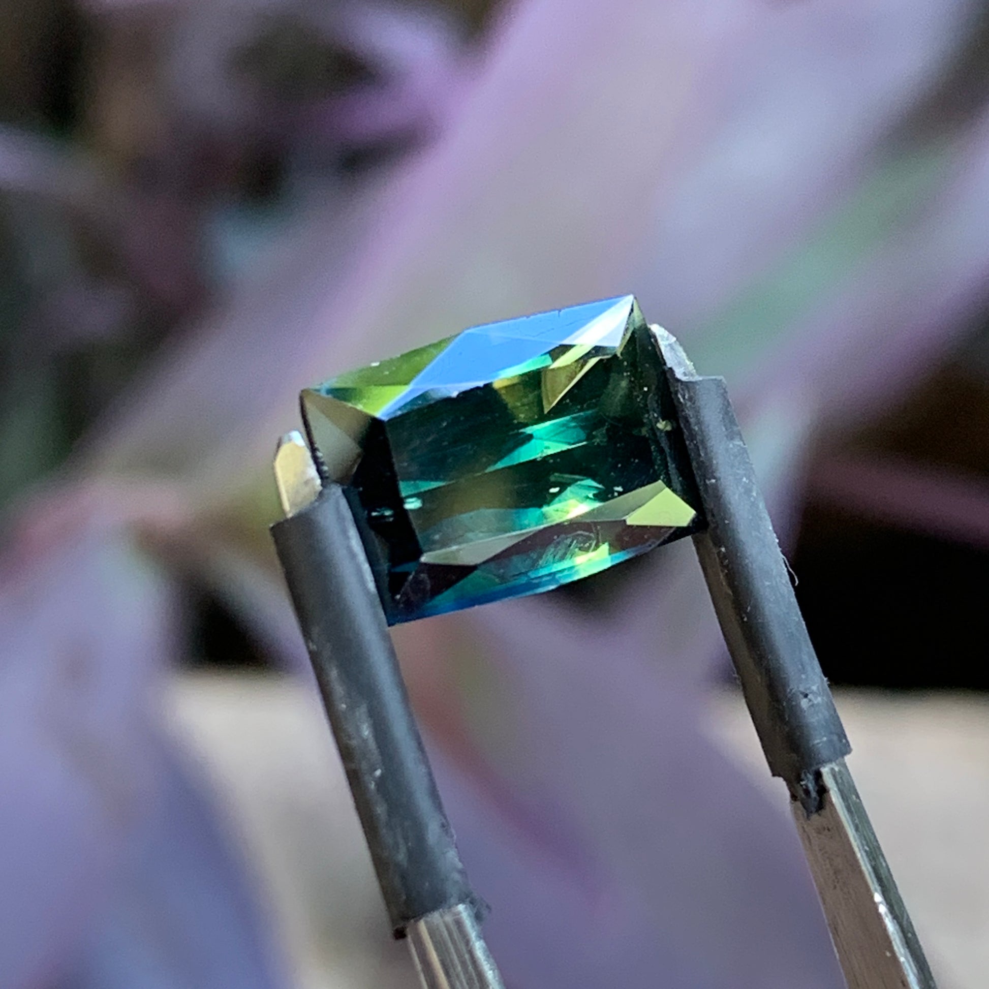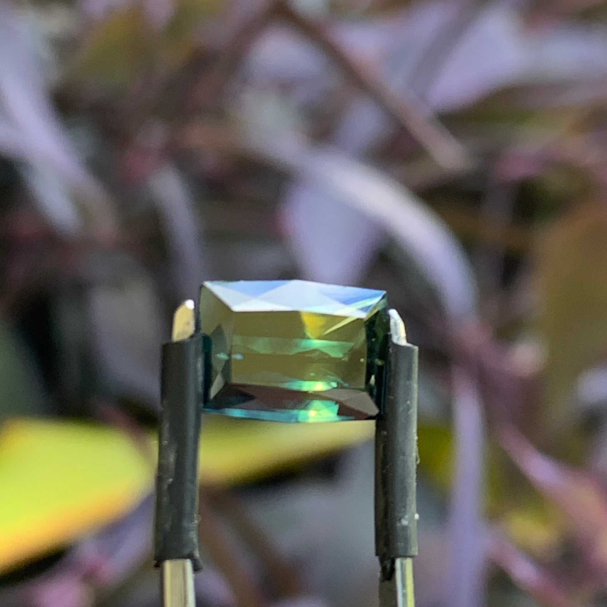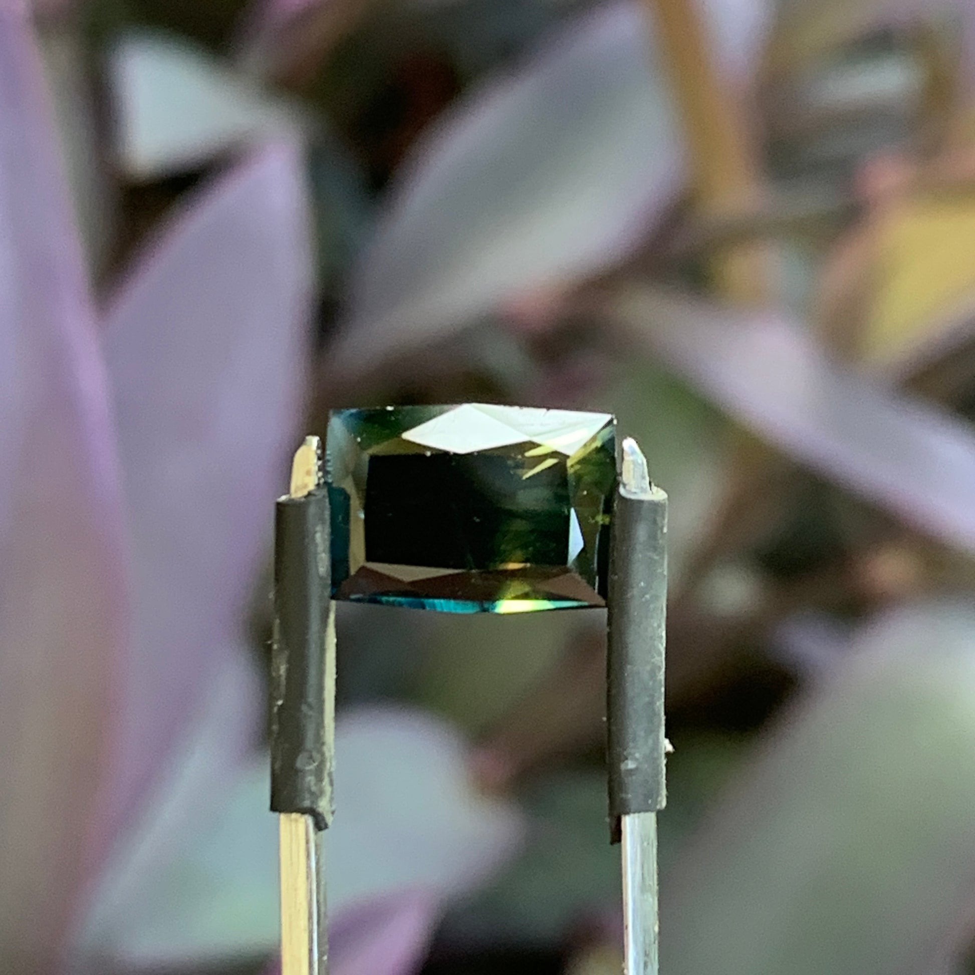 This particular stone is cut into emerald mix cut, with a primary colour of dark blue/green, good clarity eye clean stone.